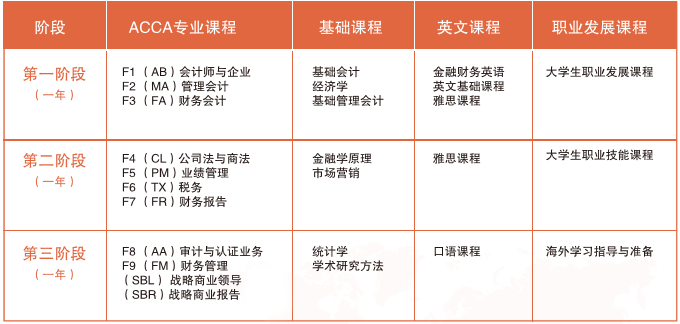 ACCA课程方向包含:基础课程、ACCA专业课程、英语课程及职业发展课程,各阶段主要课程及目标如下: