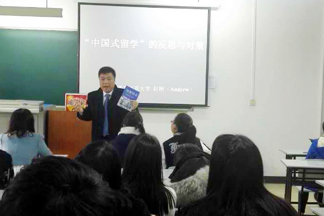 Andrew又随后做了“中国式留学的反思与对策”的讲座,根据自己的亲身经历与同学们分享了在英留学期间遇到的各种问题,比如刚到英国上课听不懂,中国学生会使用录音笔,因长期接受国内填鸭式教育,上课不敢大胆发言等等,引发学生思考,也给即将奔赴英国留学的学生提供了很多经验。