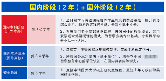 学生在四川外国语大学学习两年课程,学生顺利完成规定专业课程且成绩合格,雅思不低于6分,可豁免国外大一专业课程学分,直接进入国外合作院校继续大二和大三相应课程,符合毕业条件的学生,可以获得国外合作院校颁发的相应专业本科学历(学士学位)。