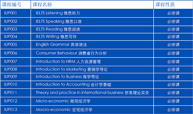 核心专业课程:雅思听力、雅思口语、雅思阅读、雅思写作、英语语法、人力资源管理、营销学导论、商学导论、会计学基础、贸易理论实务、微观经济学、宏观经济学