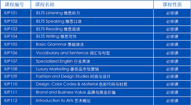 核心专业课程:雅思听力、雅思口语、雅思阅读、雅思写作、基础语法、词汇与句型、行业英语、奢侈品市场营销、时尚与设计、色彩代码与材质、品牌与商业价值、艺术概论