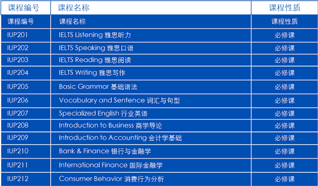 核心专业课程:雅思听力、雅思口语、雅思阅读、雅思写作、基础语法、词汇与句型、行业英语、商学导论、会计学基础、银行与金融学、国际金融学、消费者行为分析、商务沟通