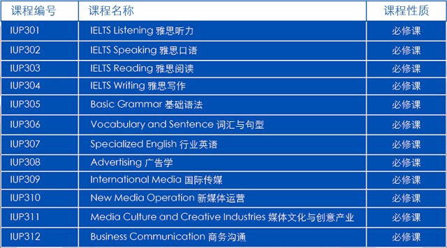核心专业课程:雅思听力、雅思口语、雅思阅读、雅思写作、基础语法、词汇与句型、行业英语、广告学、国际传媒、新媒体运营、媒体文化与创意产业、商务沟通