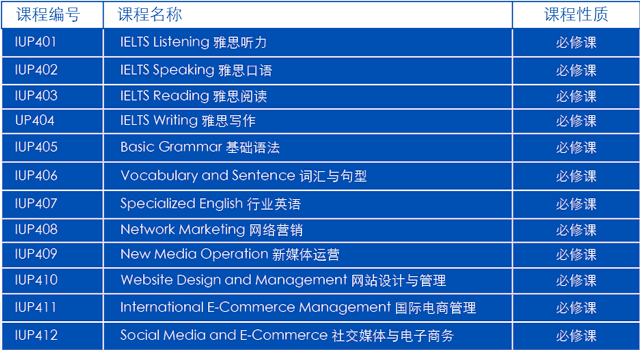核心专业课程: 雅思听力、雅思口语、雅思阅读、雅思写作、基础语法、词汇与句型、行业英语、网络营销、新媒体运营、网站设计与管理、国际电商管理、社交媒体与电子商务