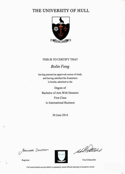 冯柏霖获得英国赫尔大学一等荣誉学士学位
