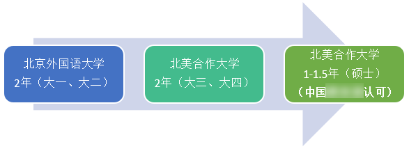 参加实验班的学生在北外完成两年的课程,之后转入北美合作学校继续学习剩余的本科两年课程及硕士课程(1-1.5年),获得国外大学颁发的学士学位和硕士学位。学生获得学士学位后,也可向我院申请其他合作大学(不限国家及专业)的硕士课程。