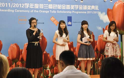 2011年6月11日,北京交通大学--萨克逊大学项目08级会计与金融专业学生谢帅颖姗和08级数字媒体艺术设计专业学生赵冰杰参加了由荷兰大使馆举办的“橙色郁金香奖学金”(OTS)颁奖典礼。荷兰橙色郁金香奖学金项目由荷兰高等教育国际交流协会合作办公室(Neso China)于2008年9月创立,旨在奖励优*的中国留学生赴荷兰留学。这是我校荷兰项目学生连续第二年荣获该项奖学金,获奖者每人将获得5500欧元的奖励。谢帅颖姗和赵冰杰于2008年入读我校与萨克逊的合作项目,三年中她们在语言能力和学术水平方面都获得了长足进步,这次获奖和她们付出的辛勤努力是分不开的。北京交通大学国际项目办公室对她们此次荣获该项奖学金表示热烈的祝贺,并希望她们能在今后的学习和工作中能够一帆风顺,再创辉煌。