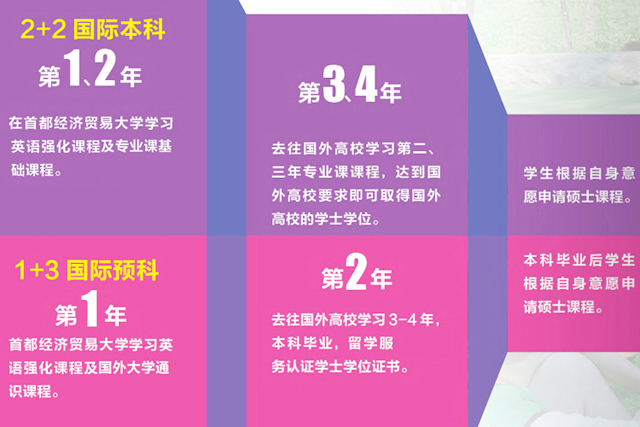 第2年:首都经济贸易大学全英文学习国外大学大一专业课程,强化英语综合能力及跨文化交流能力;