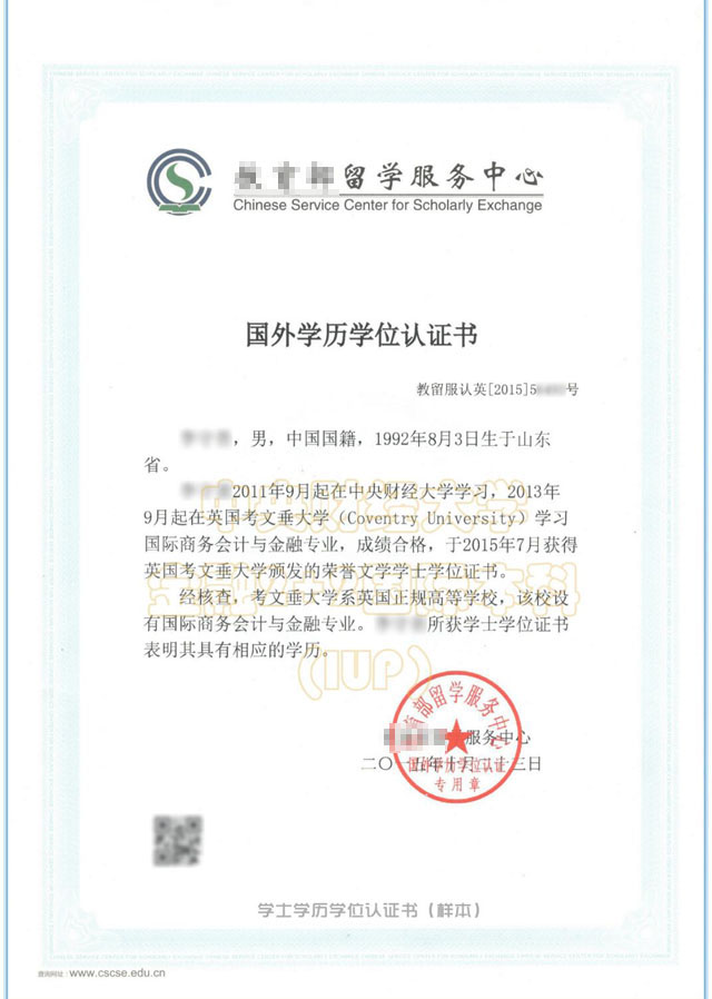 学士学位认证书(样本)
