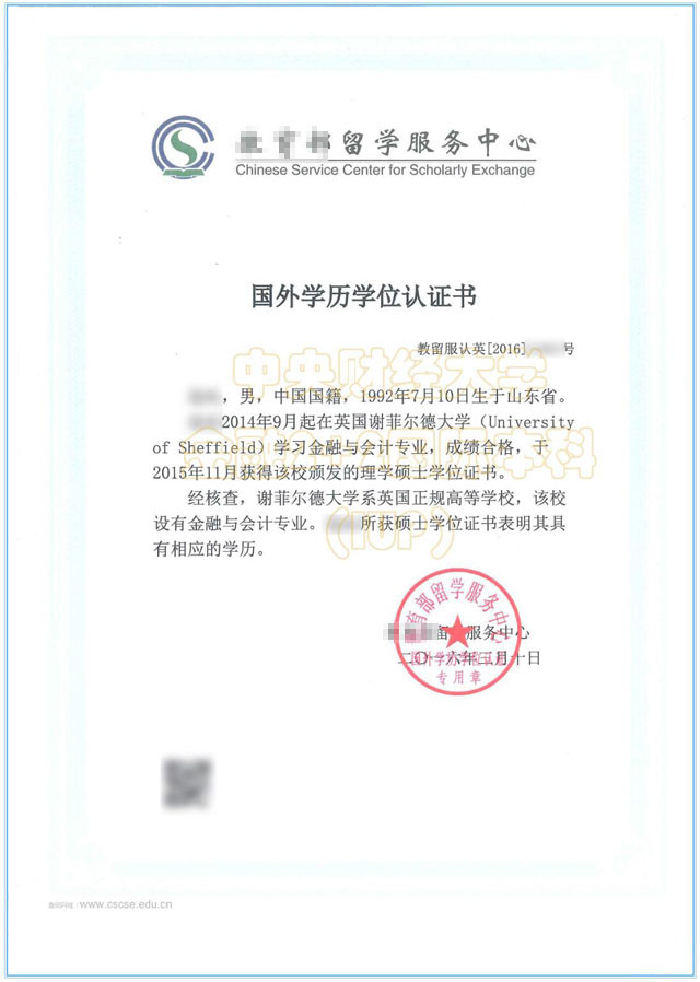 硕士学位认证书(样本)