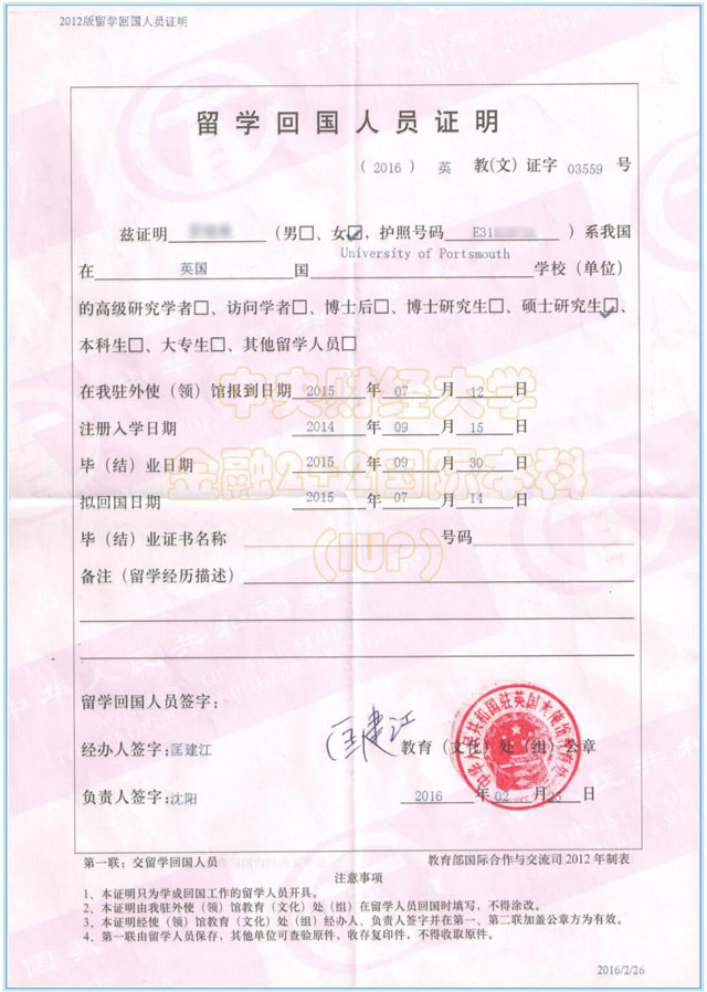 留学回国人员证明(样本)