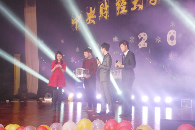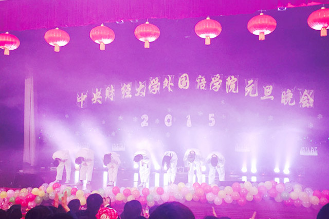 2014年12月29日晚,晚会在中央财经大学学术会堂拉开帷幕。外国语学院副院长师文杰老师,学院办公室主任李名义老师以及SQA AD中心的多位教师都前来观看了此次演出。英国哈德斯菲尔德大学和提赛德大学的老师们也前来观看晚会。