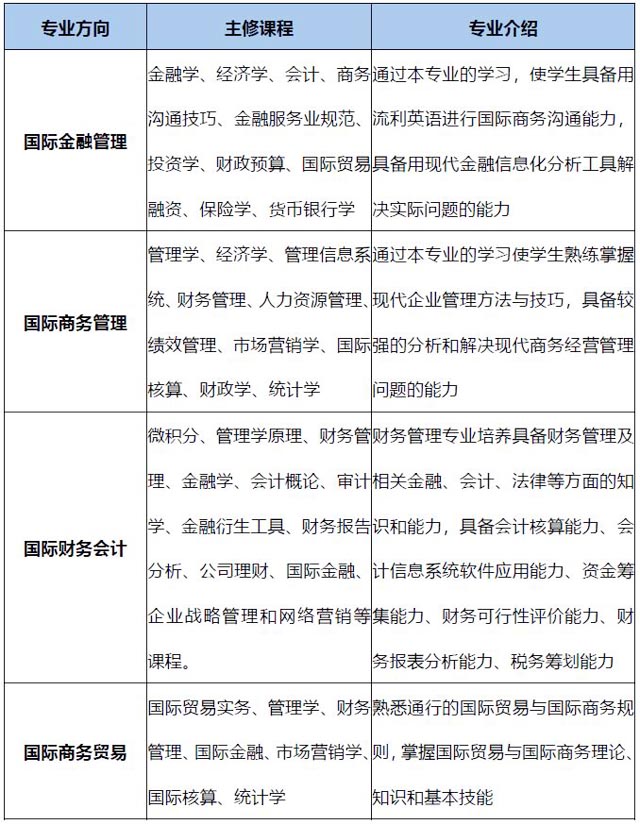 开设高含金量、高需求型专业包括国际金融管理、国际商务贸易、国际商务管理、国际财务会计,开设专业的就业前景均被广泛看好,是国内热门就业领域。