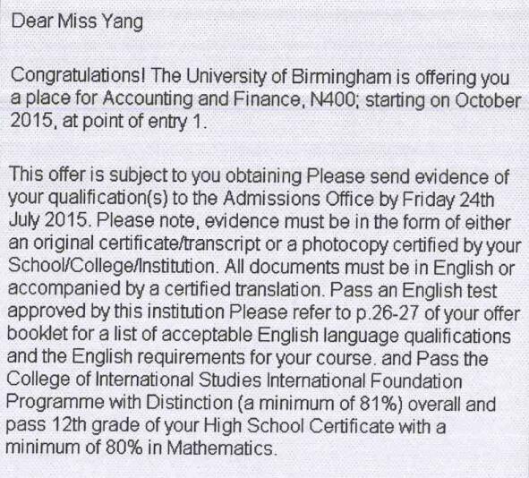 再比如说伯明翰大学,2015年其英国综合排名15、全球QS综合大学排名64,想要就读这所大学的话,不同的专业你需要满足怎样的IFC国际预科认证课程的预科成绩呢?请分别看今年毕业的同学杨越、梅茜的录取信。
