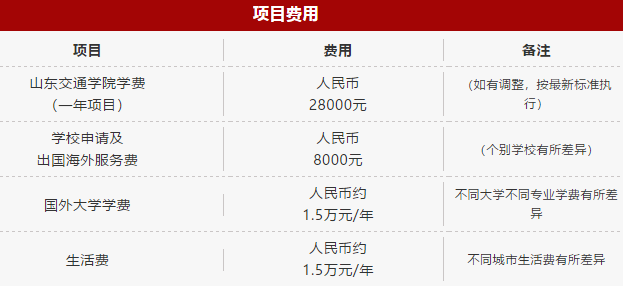 学生可申请与山东交通学院合作的多所俄罗斯或白俄罗斯友好院校就读,且在俄罗斯、白俄罗斯学习期间,学费一年在1.5万元左右,生活费1500元/月左右,留学费用少,适合工薪阶层留学,轻松实现留学梦。