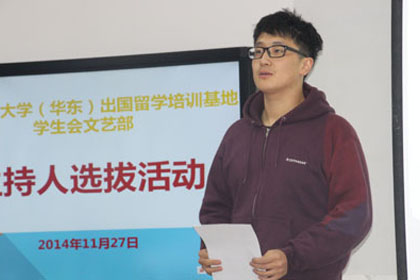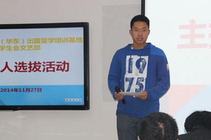 为展现出国留学培训基地学生的精神风貌,张扬青春风采,2014年11月27日晚,出国留学培训基地学生会组织的学生主持人选拔活动在国际培训中心D206如期举行。