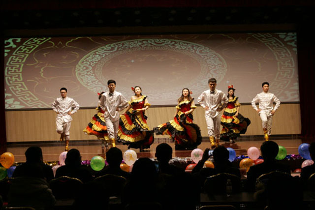 学生乐队一*激情澎湃的《私奔》引爆现场,在学生的尖叫欢呼声中拉开了晚会序幕。随后,俄罗斯民族舞蹈《金袖子》轻盈妙曼,充满异域风情;俄语歌曲《海港之夜》,仿佛把观众带到了宁静的海港;古典舞《卷珠帘》以曼妙的身姿演绎着柔美和缠绵;七种乐器演奏的经典曲目《鱼水情》,赢得观众阵阵掌声;英语话剧《荆轲刺秦王前传》和俄语反串话剧《白雪公主》,淋漓尽致的展现了学生的外语水平和表演才能;俄语朗诵《海燕之歌》,充满着俄罗斯文化气息;街舞《Own Soul》和模特走秀《男神来了之女神驾到》引起现场狂欢,优美的舞姿和青春的活力赢得了观众的掌声和喝彩;歌曲串烧唱出了多国的外语文化和青春激情;晚会在英文歌舞剧《歌舞青春》富有朝气的欢快旋律中落下帷幕。晚会期间,举行了心怀感恩,感动你我征文活动颁奖和微信送祝福抽奖活动,激发了学生参与热情,再次将晚会一次次推向高潮。