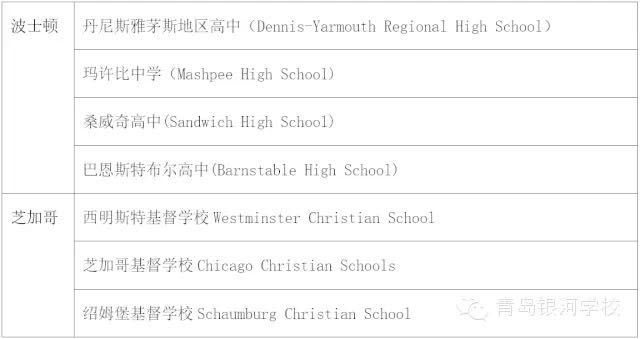 青岛银河学校与美国波士顿公立学区教育局官方合作,美方高中均为学术声誉较高的公立高中;银河学校为ACT/A-Level特许授权考试中心。